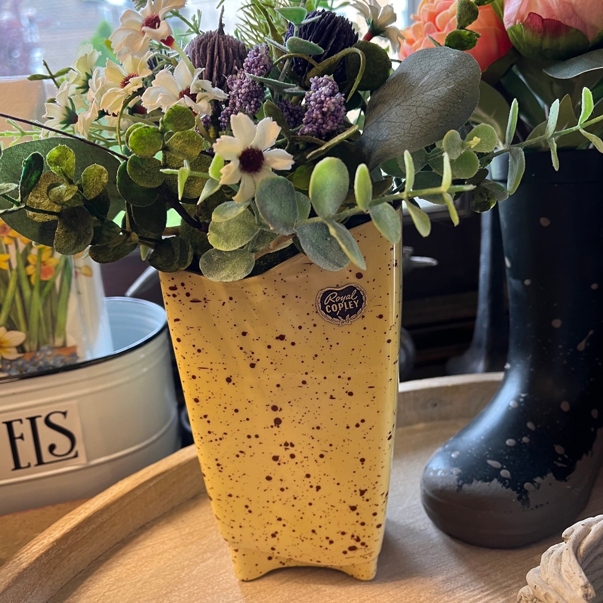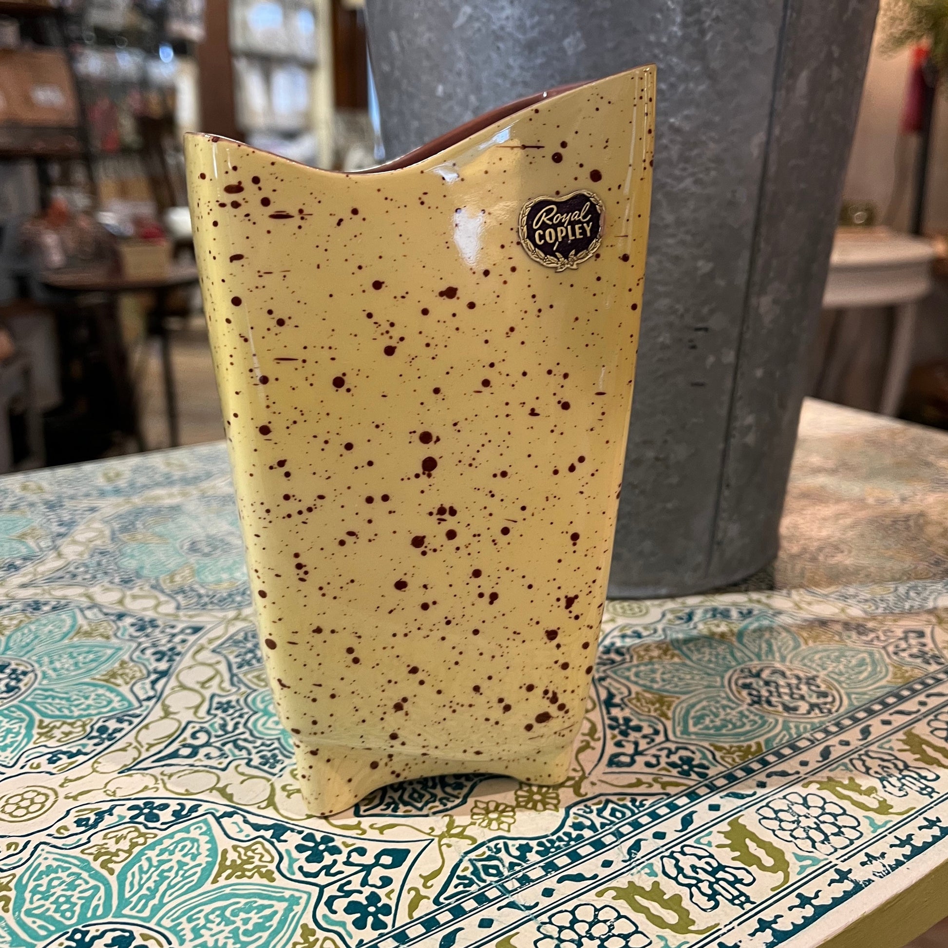 Royal Copley footed vase with splatter glaze design. A beautiful pale yellow underglaze with brown interior and splatter design. It has a graceful asymmetrical top design which makes it equally attractive with or without flowers. A one of a kind for sure that’s never been used. Abso