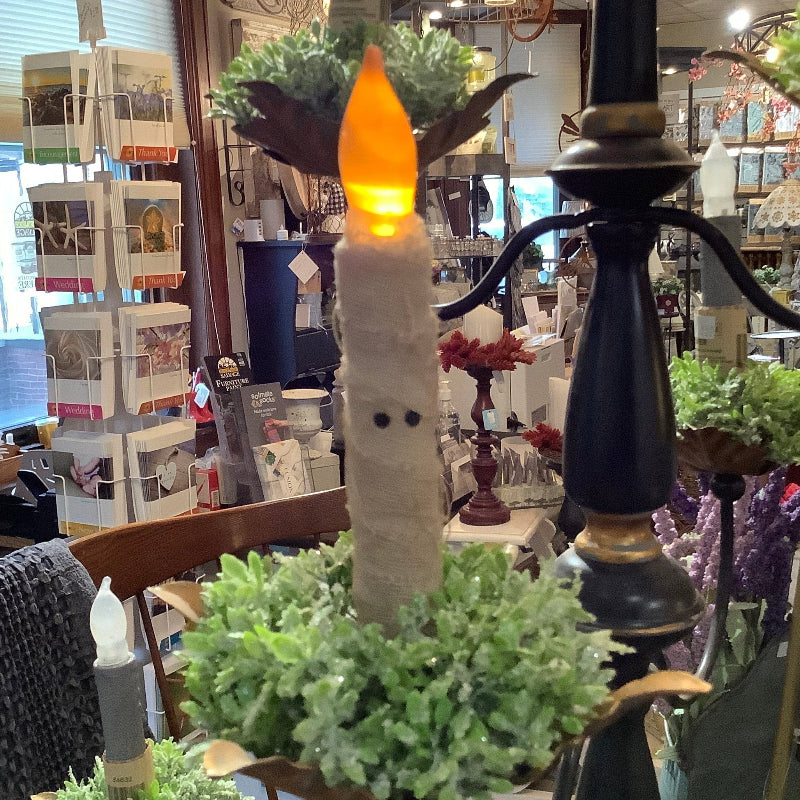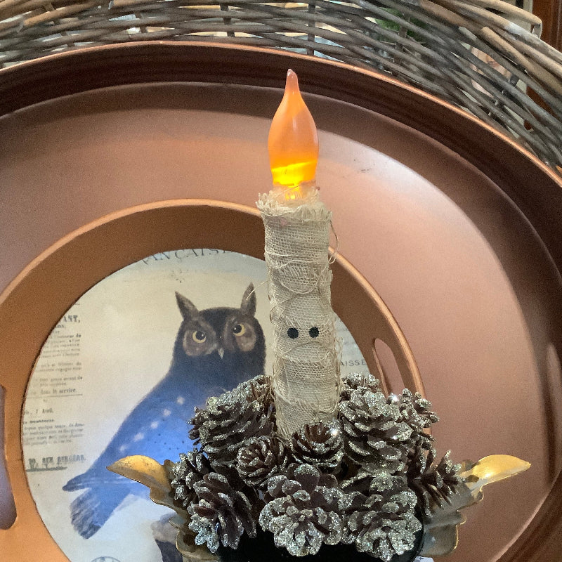 Our mummy candles add a whimsical touch to your Halloween decorating. Each mummy is hand wrapped in gauze, given a little dirt application to make him look like he just came back from the grave. They are just over 6” and would look amazing in an iron candlestick on a stack of books, mantle or even in a candelabra. They even flicker. Featuring a built in timer so you can set it and forget it for a season of enjoyment. I don’t think he will scare anyone just add smiles.