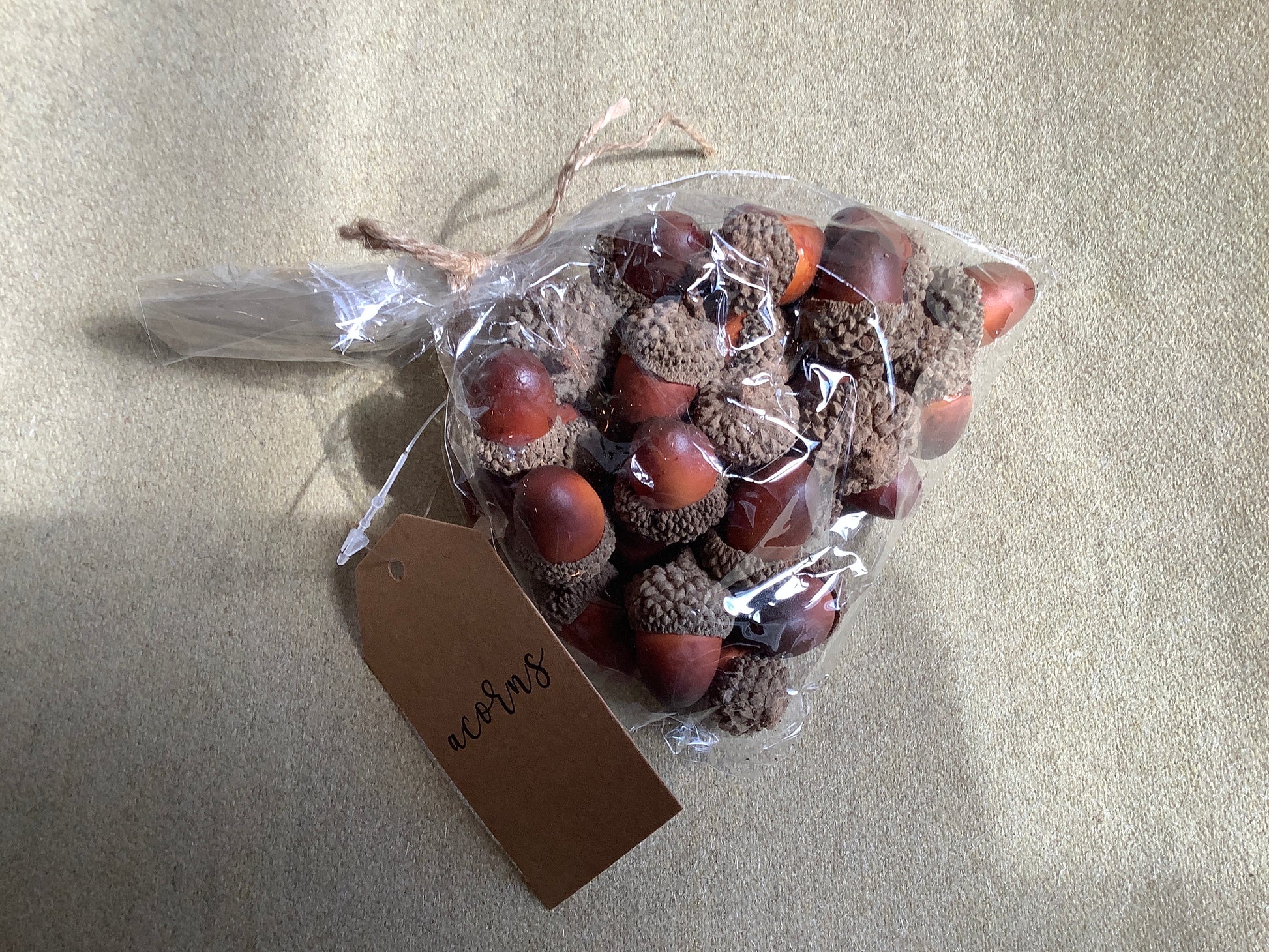 bag contains approximately 2 dozen artificial acorns with natural caps.