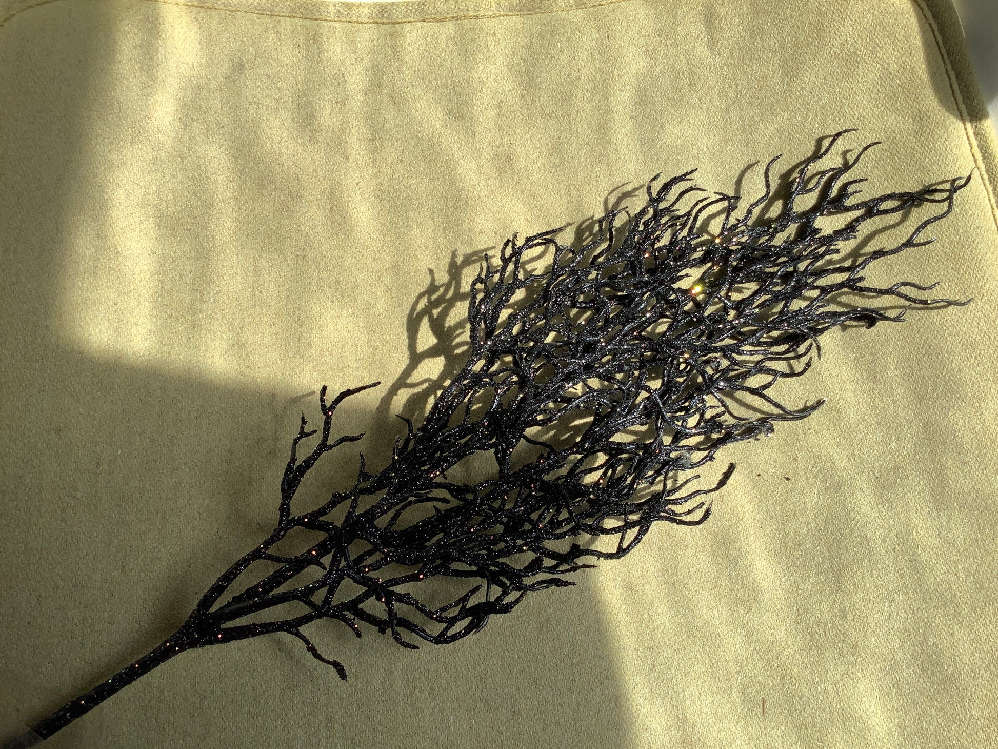 A stem pf midnight black branches covered in iridescent glitter. Perfect for a spooky centerpiece.