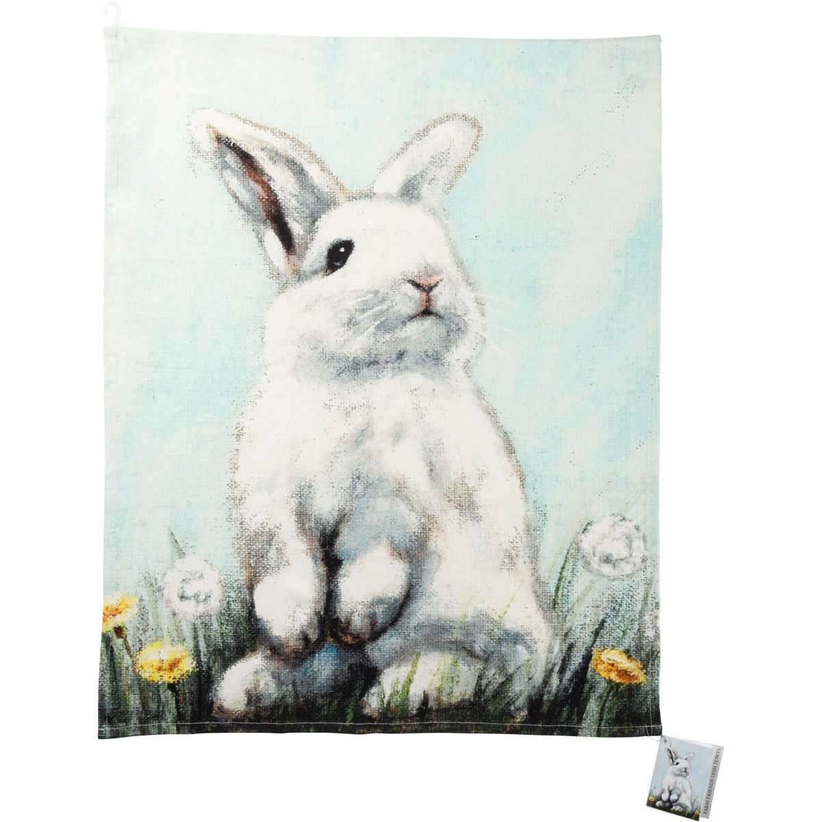 A dish towel featuring an all-over design of a bunny in a field with dandelion details, printed on cotton slub fabric. Machine-washable.