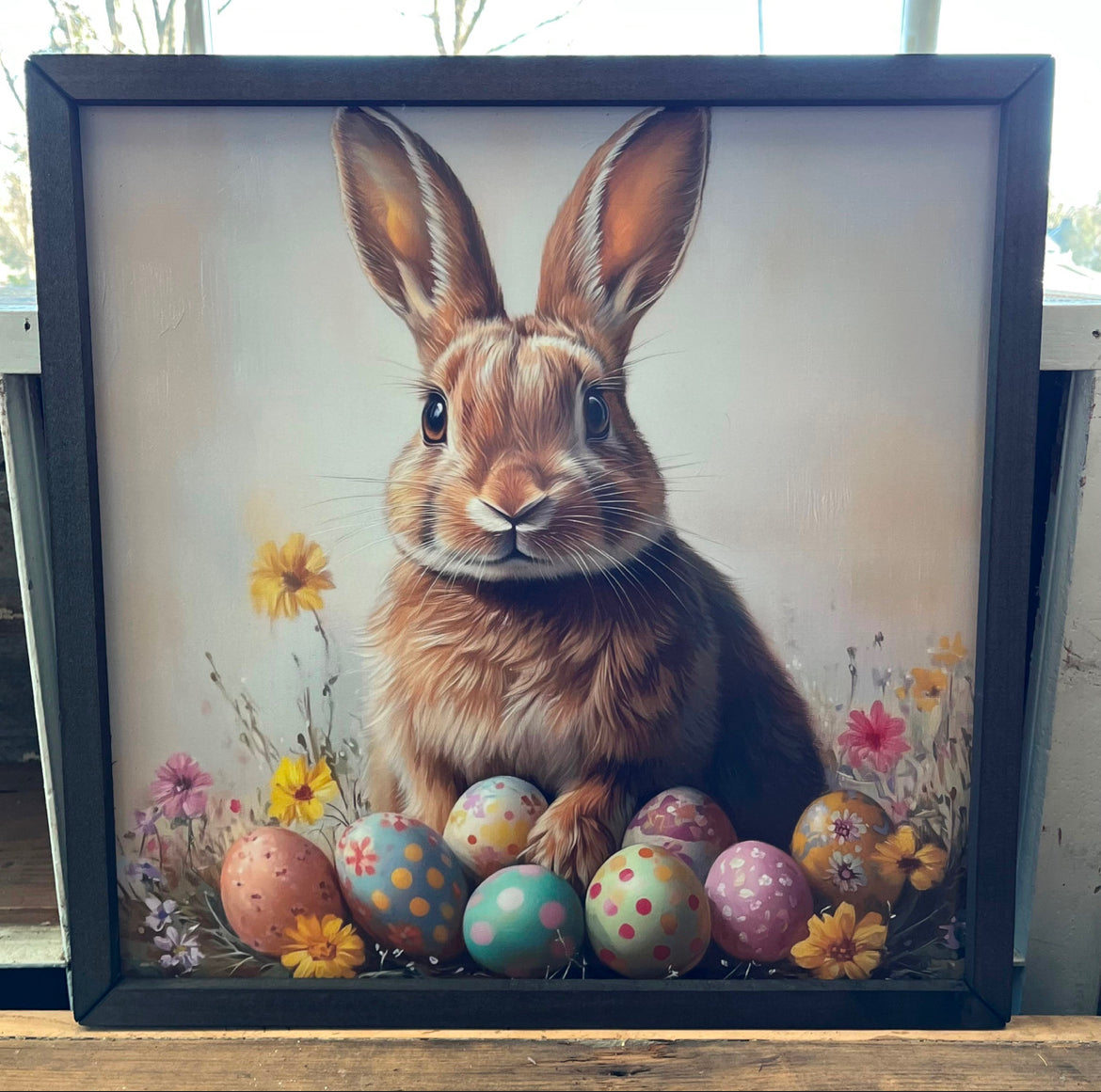 This print is mounted to hard board and is framed in a black box frame. 18” x 18” x 1-1/2”