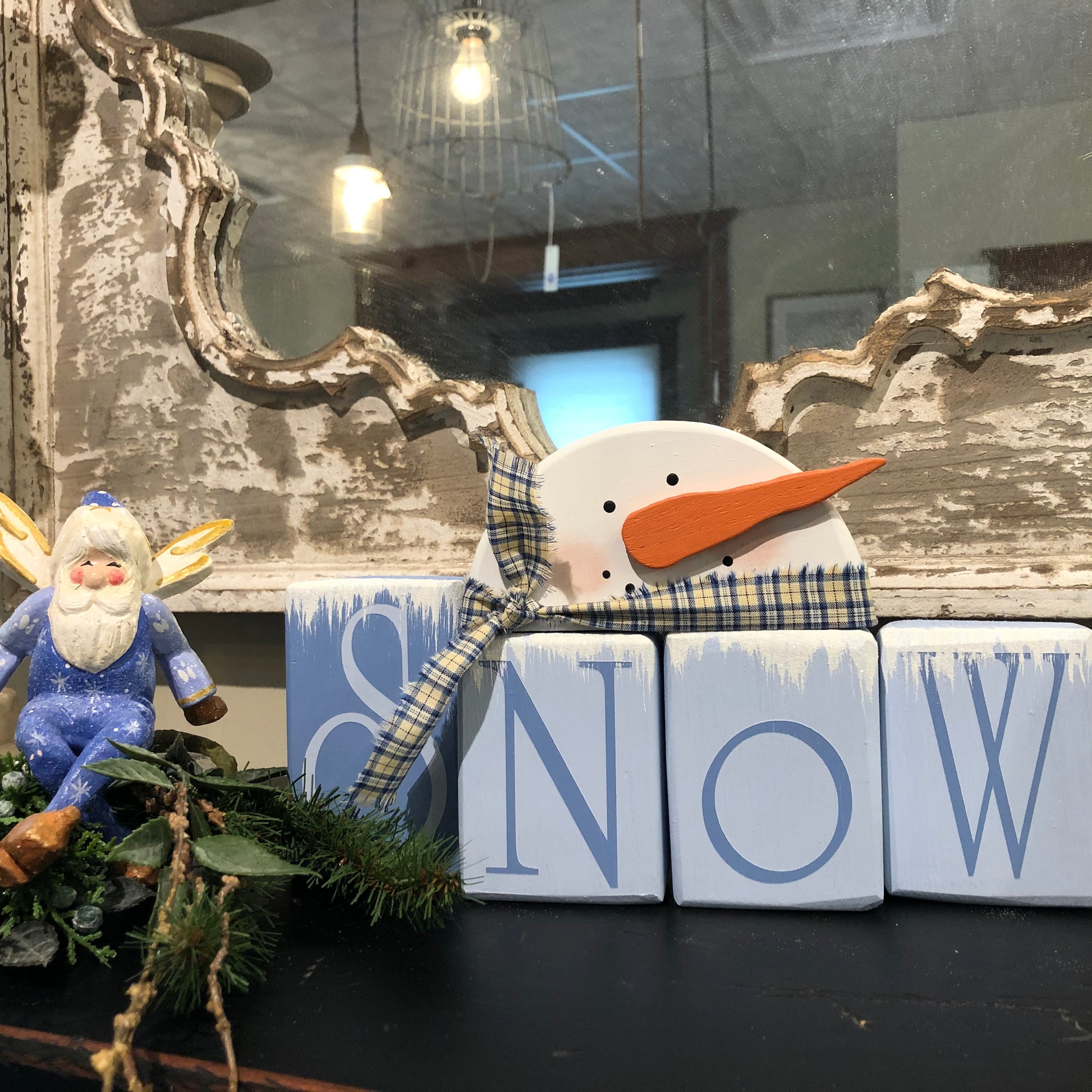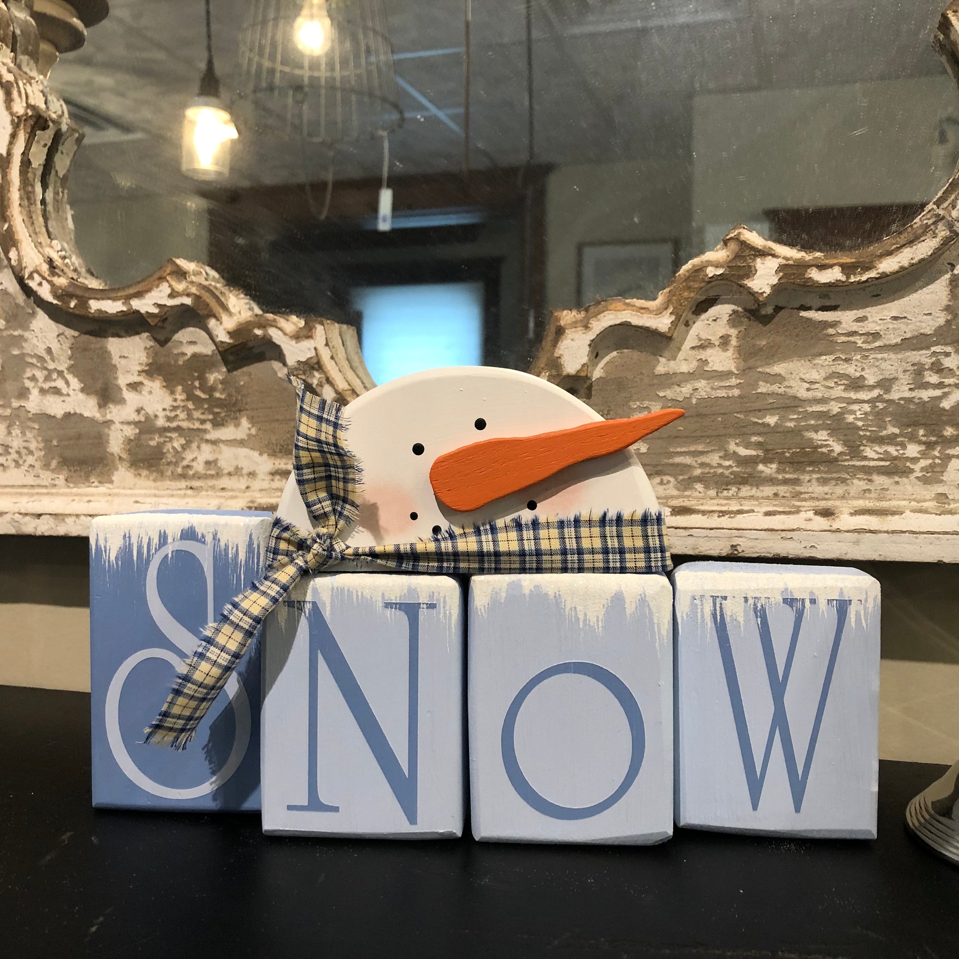 Kit includes: set of wood blocks, sandpaper, (3) sample size Fusion mineral paint in liberty blue, little whale and casement, paint brush, micro-glitter for snow, fabric scrap for scarf and pre painted carrot nose.
