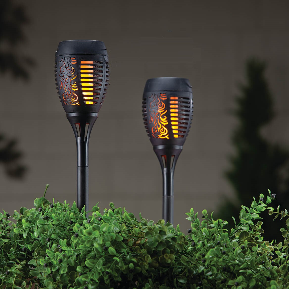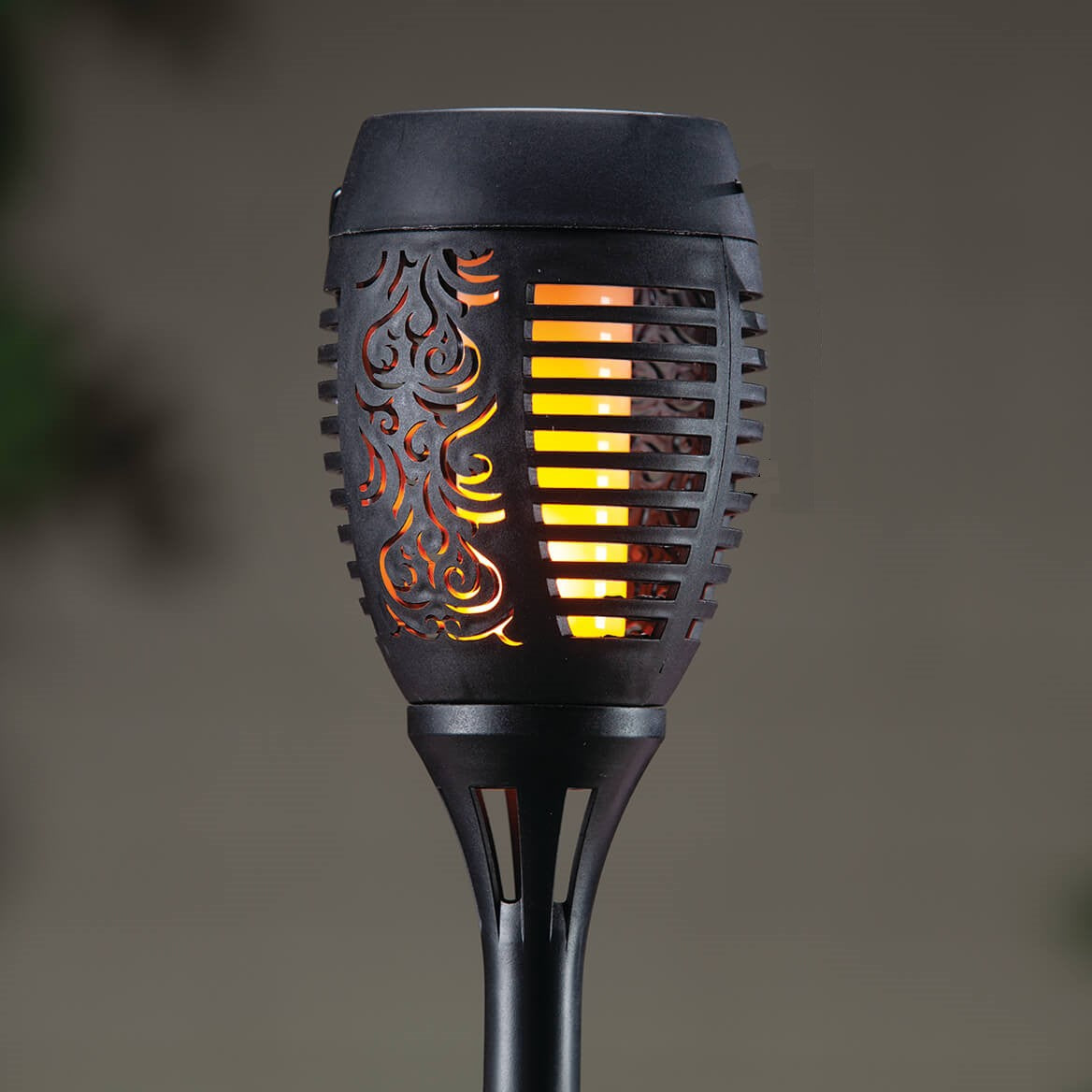 The ambiance of tiki-style torch lights without the fuss, these solar stakes glow with the look of dancing flames—but their safe LED bulbs are powered by the sun. A beautiful way to illuminate garden, patio, walkway or deck. A built-in light sensor automatically turns the flame-style lights on at dusk and off at dawn for added convenience. Simply stake these outdoor solar lights in the ground so the solar panels can charge in direct sunlight, and enjoy the realistic "flame effect" with a soft glow each evening. Features auto on/off switch. Designed in durable ABS plastic with sturdy plastic ground stake; easy 2-pc. assembly. 3 3/4" long x 3 3/4" wide x 44" high with stake.