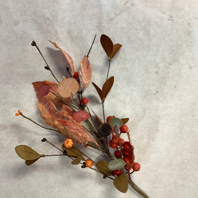 Leaves the color of a crisp fall day adorn this pick with miniature pumpkins, berries and pumpkin cut outs in green and shades of orange. Perfect for tucking in spaces where you want a little fall color. Each one is slightly different in its colors and leaf sizes so they look freshly gathered from nature.