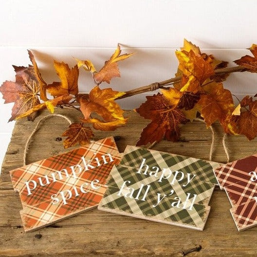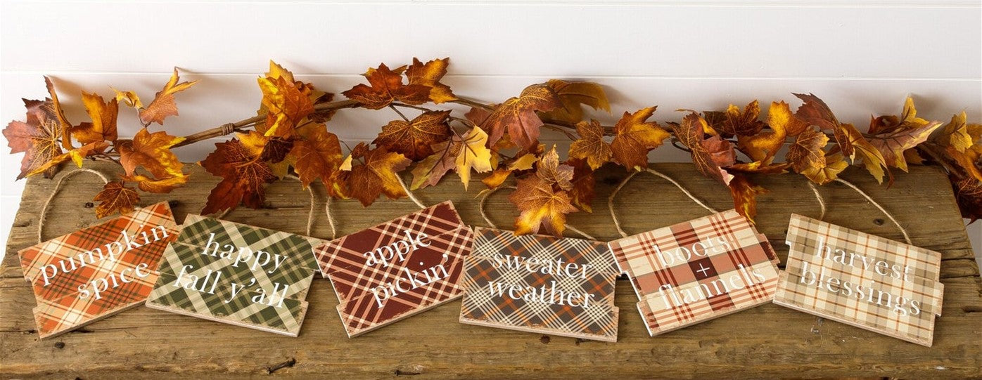 The perfect fall quotes to accent your fall decorating. six different iconic sayings printed on festive fall plaid backgrounds. These are sized to go just about anywhere at 5" x 7" complete with a jute cord for hanging.