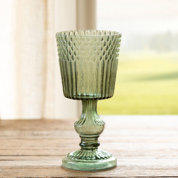 We were inspired by the vintage pressed glass we saw in our grandmother's cupboard. We gave our Maybelle Collection an update with a fresh green color. This goblet is perfect to hold candles or flowers. Group with other glass shapes for a unique tablescape. Each has a unique design.