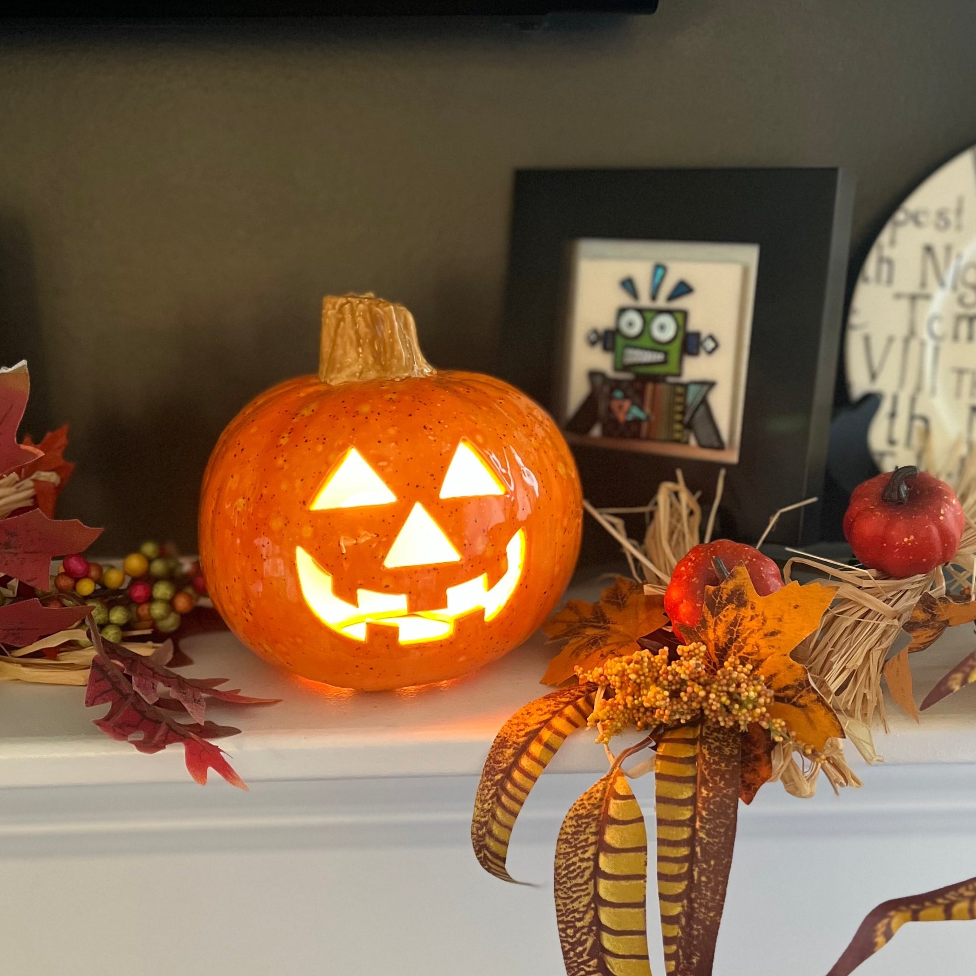 Our cute little ceramic Jack-o-lantern lights the way not only this Halloween but many years to come. We molded him dire from a real pumpkin so he is legit without any of the mess associated with carving a real pumpkin. Each one is slightly different as the faces are cut by hand. This is a custom product, so bear with us. Lead time is 3 weeks from order placement. Approximately 6” x 6”. Comes with a switched corded light suitable for a 7 watt night light bulb (included).