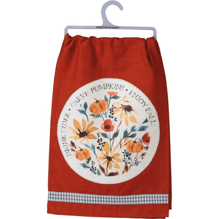 100% cotton towel with grey check boarder and a circle of the most beautiful fall flowers. “Drink cider, carve pumpkins and enjoy fall”.