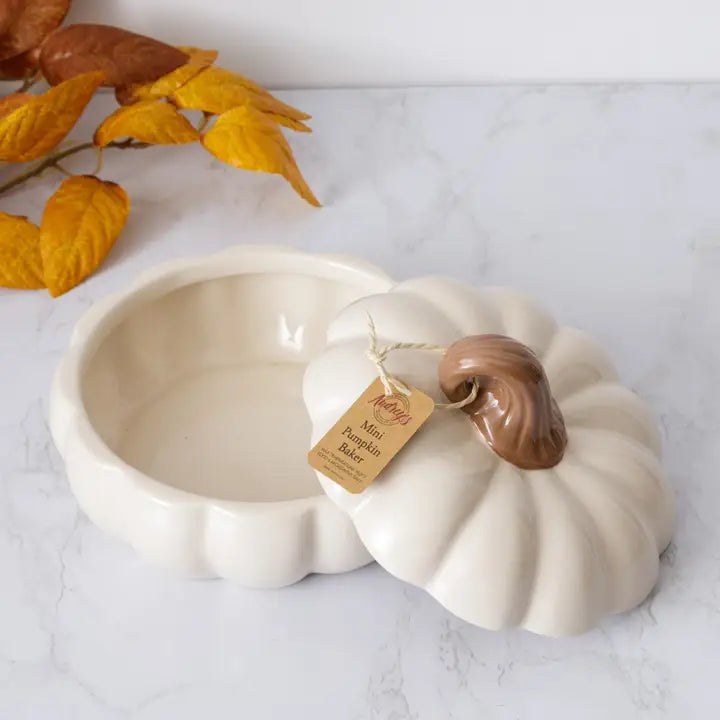 Our ceramic pumpkin baker is a nice shallow dish perfect to warm up a small wheeel of Brie. Makes a beautiful presentation or use it to hold holiday candies. Microwave and dishwasher safe.