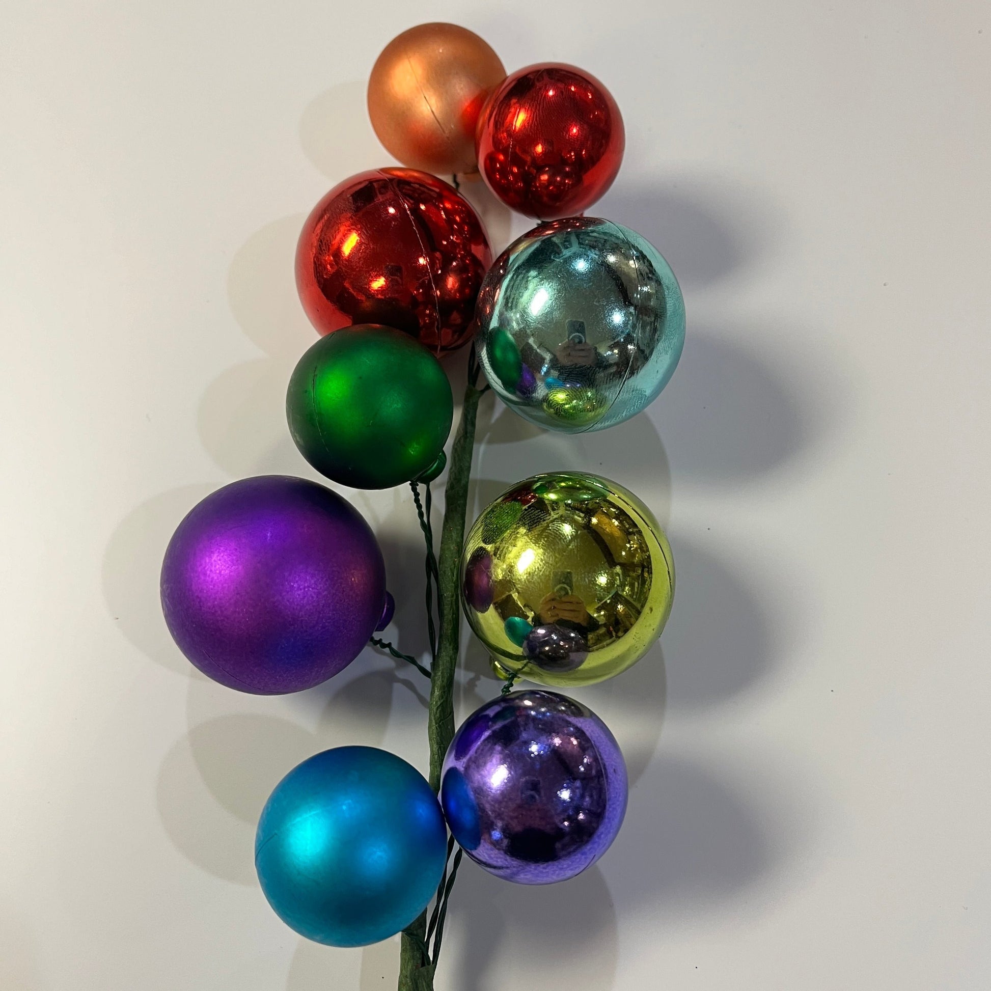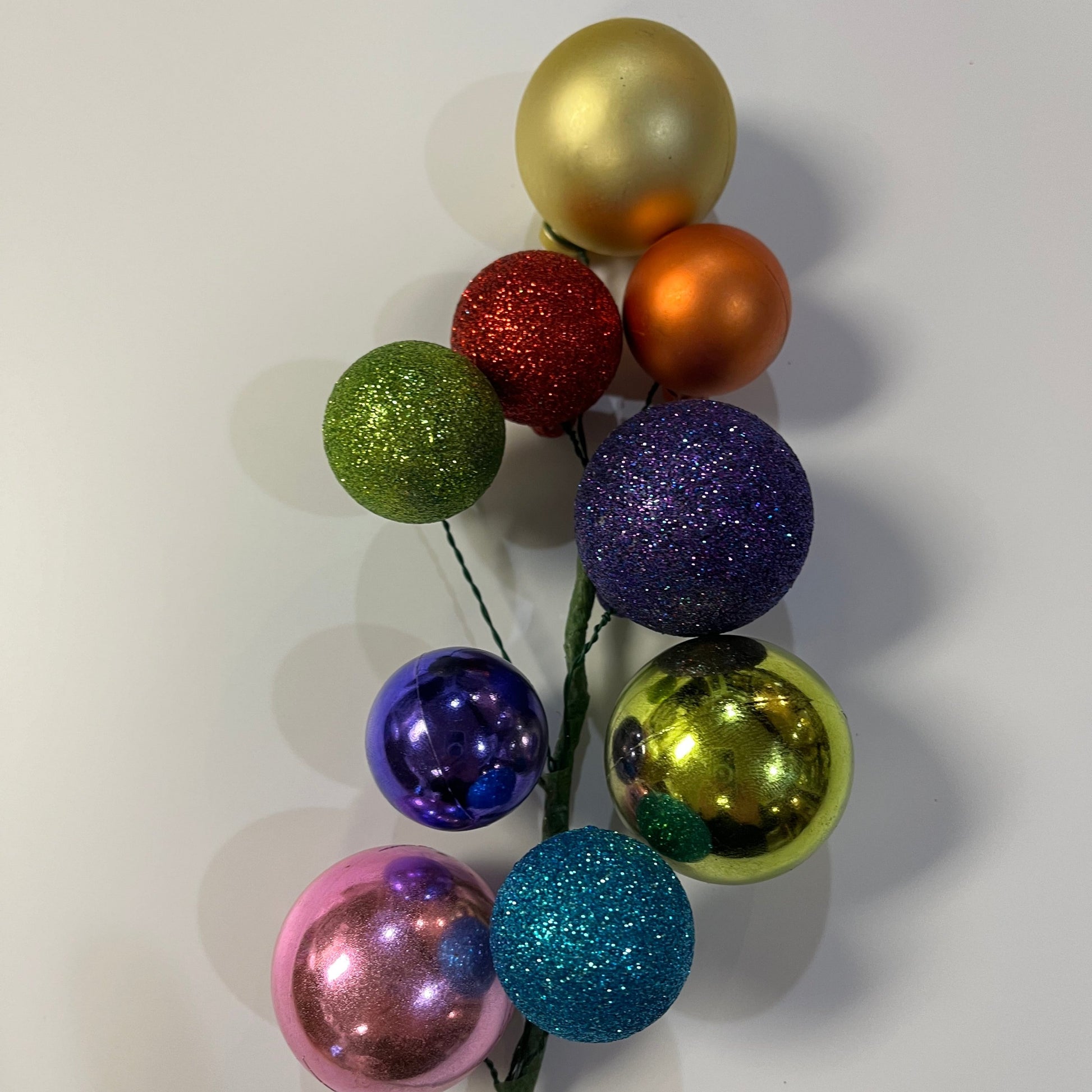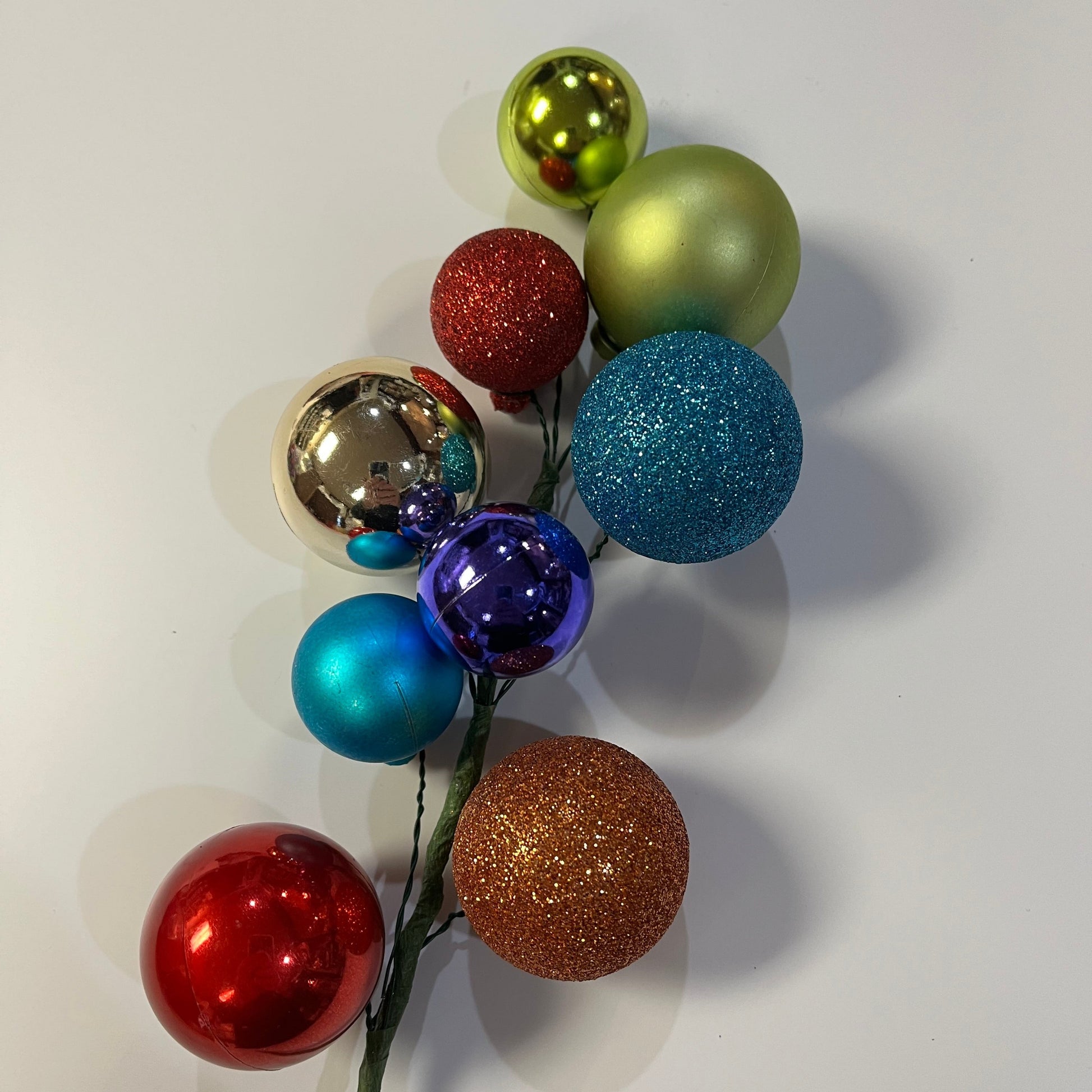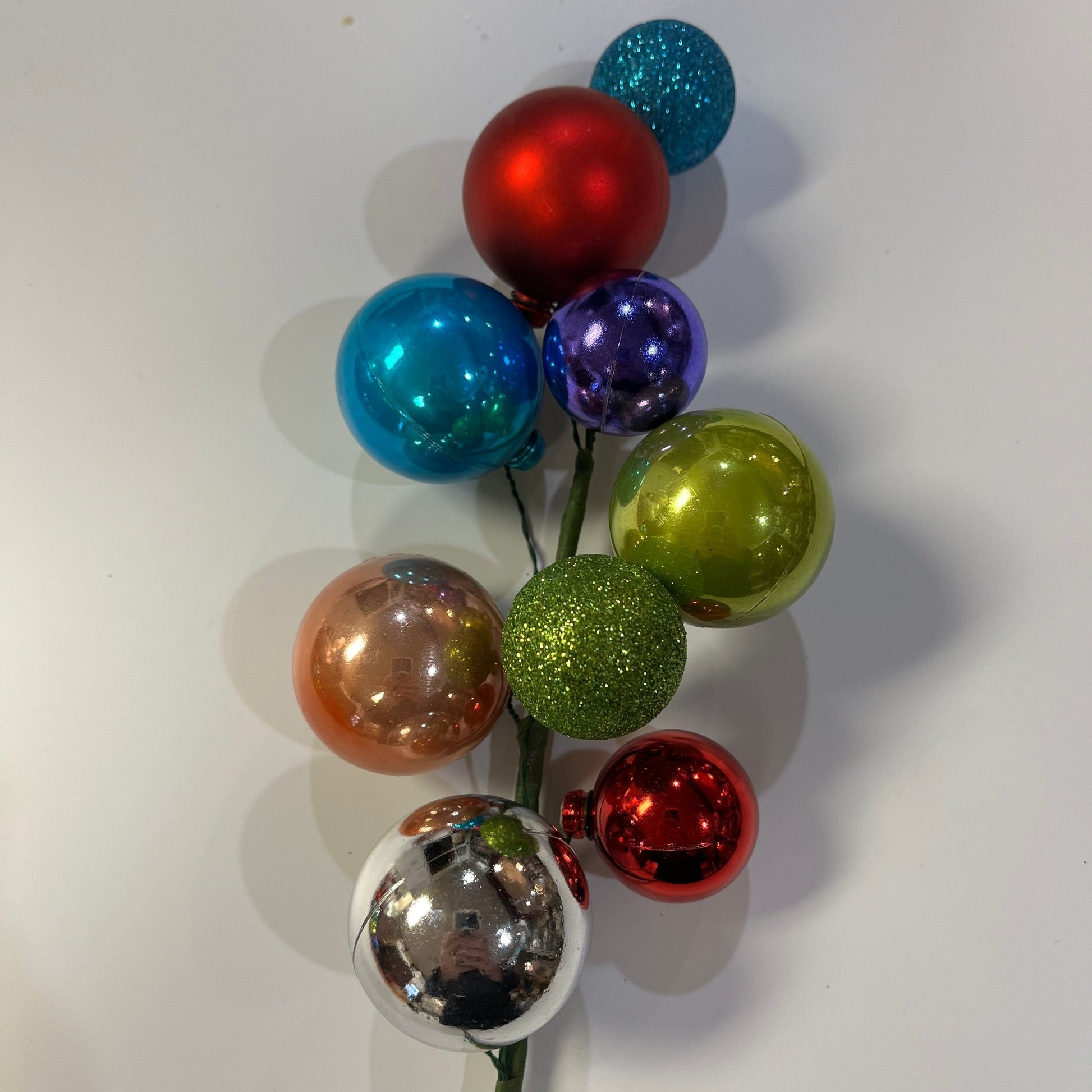 This fabulous ornament pick is perfect for instant decorating. Multicolored balls in various sizes bedeck this 16” long pick. Perfect for wreaths, garlands or that pesky hole in your Christmas tree. We offer these in classic and multicolored. Since these are hand made some variations in color or finish may occur.