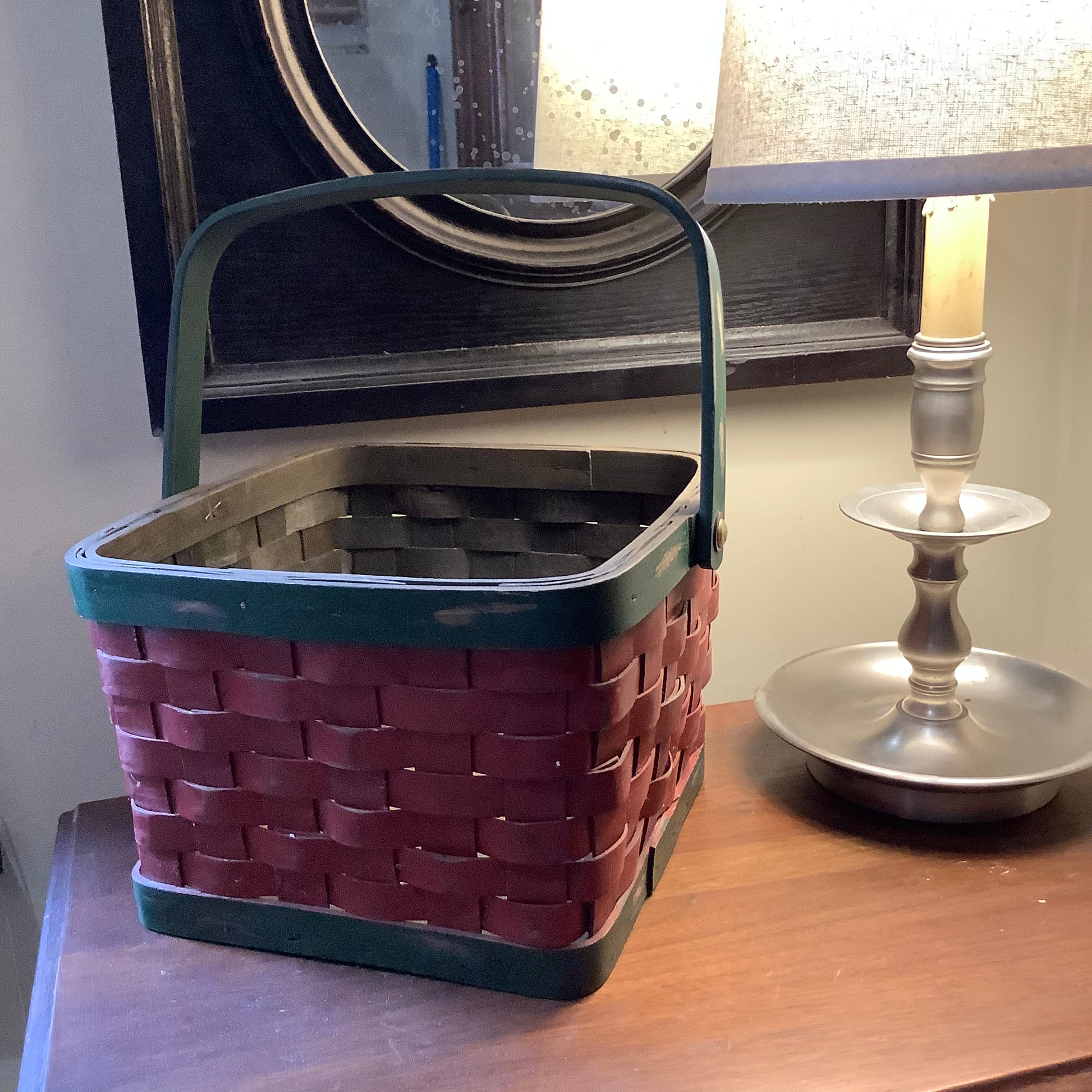 Beautifully made split basket painted red with green trim and handle. A must have for a modern farmhouse at Christmas or any time of year. Available in two siz