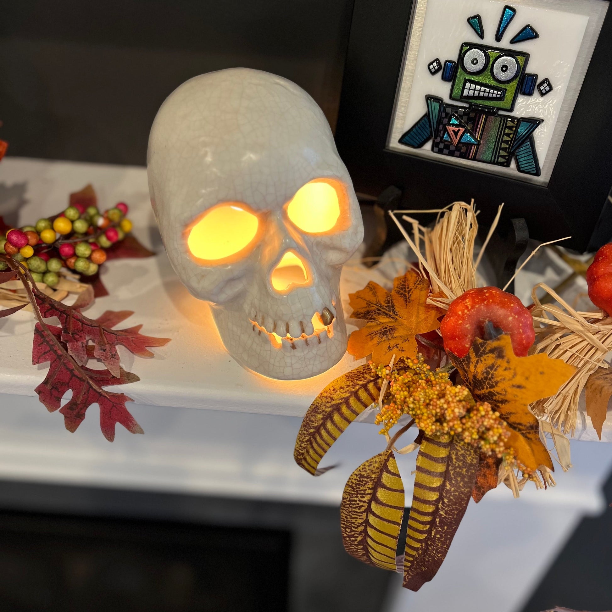 Our ceramic skull has a realistic look about him that will make people think who did you kill to get the scull! Not really. We think he is a little bit spooky with a sense of humor. We crackled the glaze and aged it just a bit to make him look like he did come out of a grave. Hand sculpted the teeth so no two are exactly alike. We added a little gold enameled paint on one tooth for a little humor. This is a custom product, so bear with us. Lead time is 3 weeks from order placement. Approximately 6” x 6”. Comes with a switched corded light suitable for a 7 watt night light bulb (included).