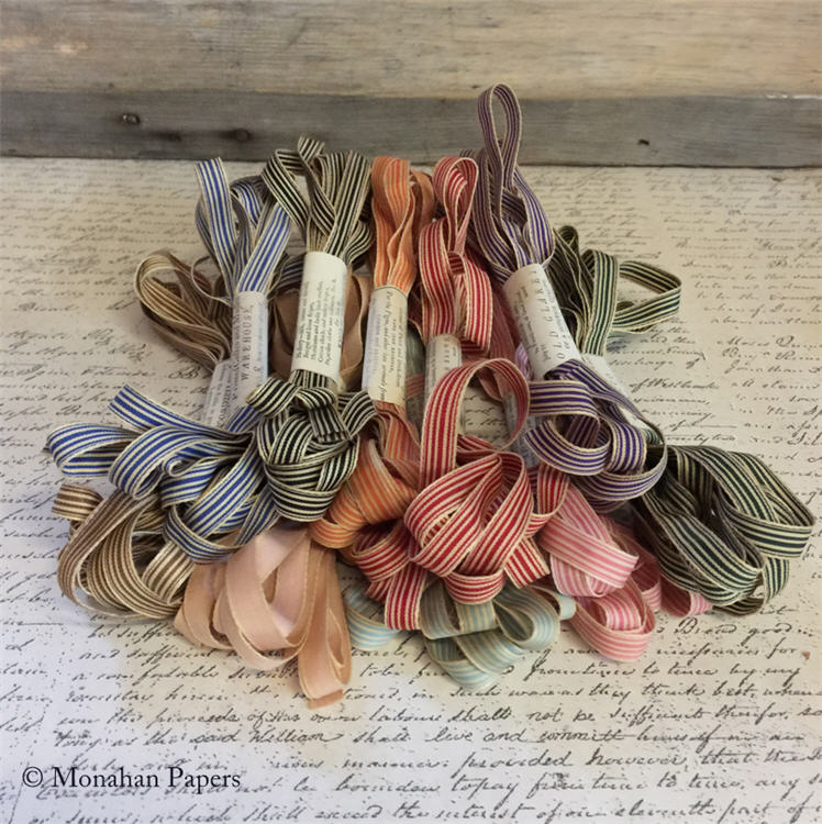 These beautiful striped fabric ribbons come in 5 yd bundles. They are 1/2" wide and are wrapped in Monahan Papers. Use these when you want a little accent or use them to tie up a present for someone special.