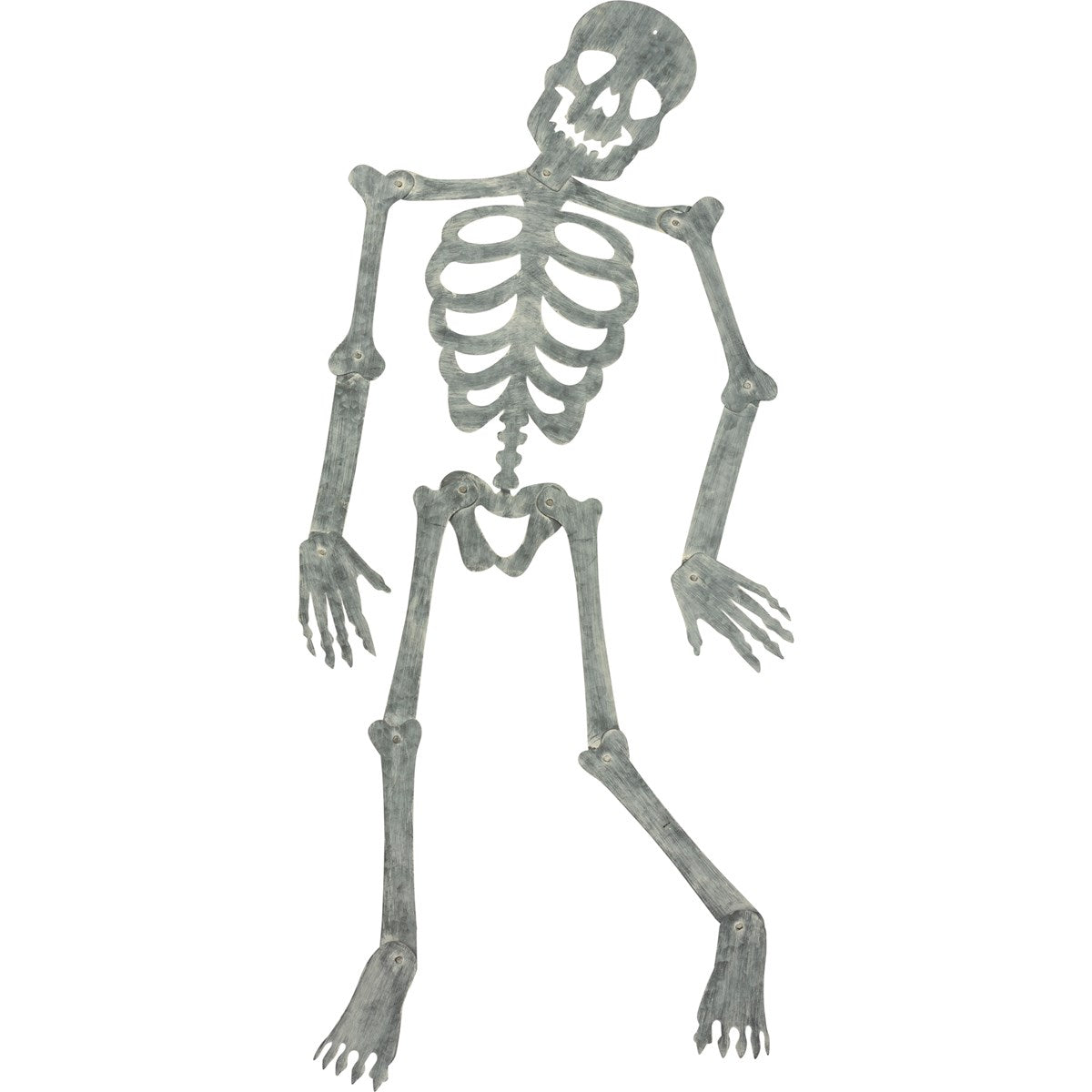 A large galvanized metal wall décor piece featuring a skeleton shape with adjustable joints. 14.25" wide x 43" tall